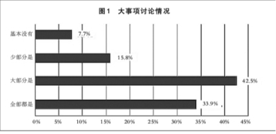 丰台将中国传统的“乡绅治理”与现代中国“民生民主诉求”结合起来,以社区事务会商会为核心,让政府职能部门参与进来,依托“四个平台、四类人群”为居民办小事。四个平台包括“议事平台、监事平台、处事平台、评事平台”,四类人群包括社区内“起骨干作用的人大代表、核心角色的居民代表、基础地位的普通居民、重要补充的流动人口”,通过这四类人在四个平台上的碰撞、会商,确保“小事会议定,大事不出街”。由于会商会的决策、执行透明度及事物监督具有实效性,居民对政策条款、决策背景都有了切身的认识,其与街坊邻里、社区工作人员、机关工作人员之间的交往层次逐步深化,缓解了猜忌和误会。调研中,在问及“所在社区/村内的重大事项是否经过居民/村民代表讨论后决定”时,选择“全部都是”和“大部分是”的占到33.9%和42.5%,只有7.7%的人认为社区内的重大事项“基本没有”经过会议讨论(见图1)。