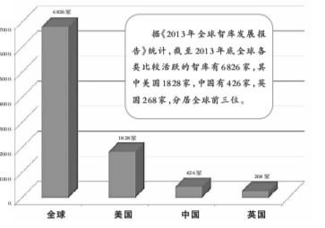 据《2013年全球智库发展报告》统计,截至2013年底全球各类比较活跃的智库有6826家,其中美国1828家,中国有426家,英国268家,分居全球前三位。