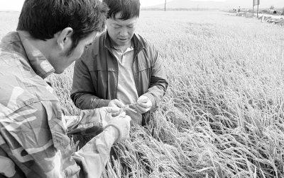 发展现代大农业,必须加快培育农业合作社等新型农业经营主体。图为黑龙江省饶河县富饶水稻合作社理事长董良臣(右)在万亩水稻示范基地察看即将收获的水稻。CFP