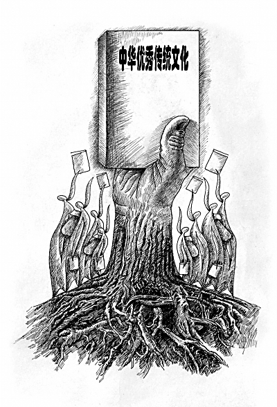 应编写弘扬中华民族传统美德的学习教材,促进其扎根普及。 禹天建/绘