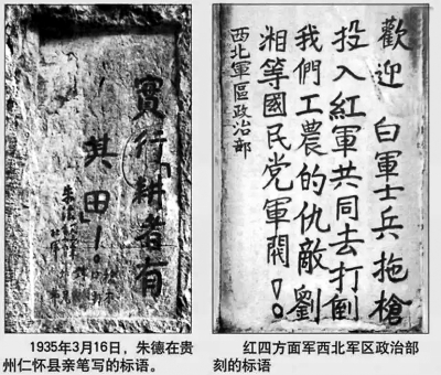 其二,绘制宣传画。在书写、镌刻标语口号的同时,红军还经常会在墙壁或门板上绘制一些生动形象的宣传画。例如:在贵阳高坡乡街上村的墙壁上,画着一幅众人齐心协力杀敌的漫画,旁边是“白军弟兄团结起来杀死狗贪官,与红军联合一同到北方打日本帝国主义去!”的标语;在贵州鸭溪地区民房的门板上,画着“运动战”的旗子,标题是“把运动战的特长最高地发扬起来!”这些宣传画惟妙惟肖,生动表达了红军土地革命政策和北上抗日主张,很受当地民众喜欢。