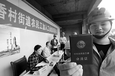 6月1日,在安徽省合肥市蜀山区稻香村街道一处回迁房建筑工地上,一名农民工在展示刚刚拿到的工会会员证。(陈三虎摄 光明图片)