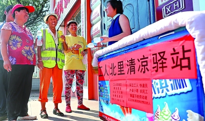 近日,河北省秦皇岛市海港区河东街道工人北里社区设立“清凉驿站”,向环卫工人、农民工等劳动者免费供应消暑饮品。曹建雄摄/光明图片