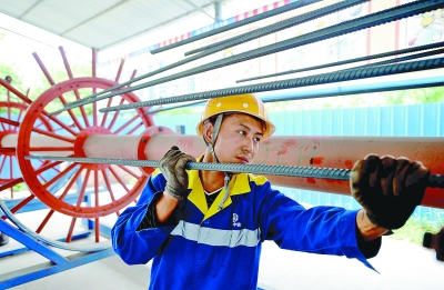 中铁七局西安公司工人在西安站改项目工地上准备捆扎钢筋。新华社发