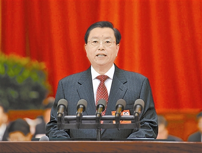 三月九日,十二届全国人大常委会委员长张德江受十二届全国人大常委会委托,向十二届全国人大二次会议作《全国人民代表大会常务委员会工作报告》。新华社记者 张铎 摄