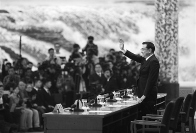3月16日上午,国务院总理李克强在北京人民大会堂与中外记者见面,并回答记者提问。图为李克强总理步入会场后向记者挥手致意。本网记者 杨登峰摄