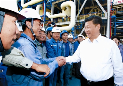 在宁东能源化工基地,习近平察看煤制油项目变换装置区,结合展板和主要产品展示,了解宁东基地规划建设总体情况,同技术研发团队代表交流。习近平指出,在我国西部建设这样一个能源化工基地,特别是建设一个目前世界上单体规模最大的煤制油项目,具有战略意义。要再接再厉,精益求精,严把技术关、质量关、安全关、环保关,保质保量按期完成建设任务。正在施工的员工们得知总书记来了,站在作业平台前齐声向总书记问好,习近平频频向他们挥手致意,并对员工们说,社会主义是干出来的,我向为社会主义大厦添砖加瓦的所有建设者、劳动者表示敬意。民族复兴事业前途光明,全面建成小康社会胜利在望,我们要埋头苦干、真抓实干,不断取得一个个丰硕成果。总书记热情洋溢的话语,感染了现场每个人,掌声经久不息。