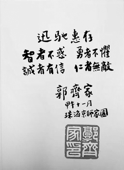 2011年,郭先生为国学社社庆题写贺词:“‘为天地立心,为生民立命,为往圣继绝学,为万世开太平’!‘和经典为友,与圣贤同行’!为每一个生命的喜悦幸福与中华民族的伟大复兴而不懈努力,愿与国学社同学共勉!”体现出了他对学生的殷切期待。