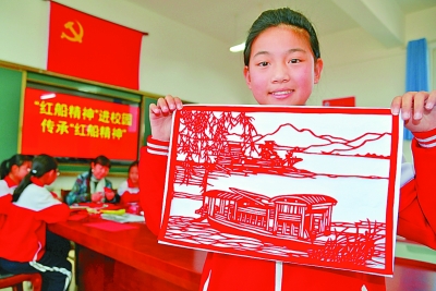 2017年12月19日,山东省东营市东营区黄河路街道中学师生在进行《红船》剪纸创作活动。山东省东营市东营区组织开展“红船精神”进校园活动,让学生们在活动中潜移默化地了解中国共产党革命历史,传承红色基因,弘扬红船精神。刘智峰摄/光明图片
