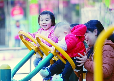 浙江义乌七一村积极发展村级集体经济,全体村民以土地入股实行年终分红,村容村貌发生了翻天覆地的变化。图为两名儿童在七一村公共健身设施上玩耍。新华社发