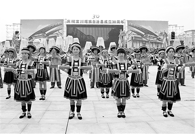 广西认真履行维护团结第一职责,着力巩固平等团结互助和谐社会主义民族关系。图为广西富川瑶族自治县成立30周年县庆。