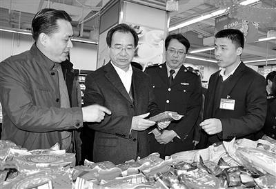 全国人大代表、广西梧州市市长朱学庆(左二)在调研商贸服务业发展情况