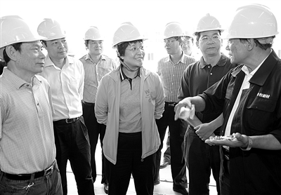 全国人大代表、广西钦州市委书记肖莺子(中)在钦州市钦北区调研项目建设推进情况。谢勇云摄