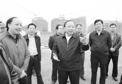 全国人大代表、广西贺州市委书记赵德明(中)在贺州市贺高迁建工程项目工地调研项目建设