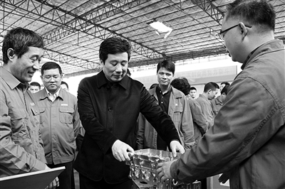 全国人大代表、广西玉柴机器集团董事局主席晏平(中)在玉柴生产车间调研