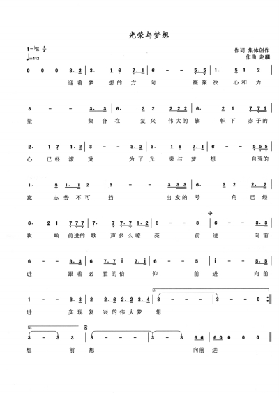 为庆祝新中国成立65周年,用歌曲的形式大力宣传和讴歌中国梦,激励人们积极投身实现民族复兴的伟大事业,日前,中国梦主题歌曲创作推广组委会遴选出《光荣与梦想》《天耀中华》等20首中国梦主题第一批新创作歌曲,并向社会推广。为了让广大读者更好地了解和传唱这20首歌曲,本报将从今日起开设“中国梦主题新创作歌曲”专栏,每周介绍一首歌曲。