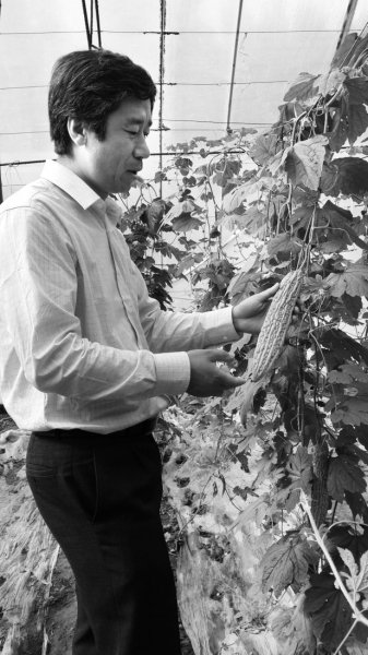 图为天津科润蔬菜研究所所长张斌在大棚内观察苦瓜生长情况。