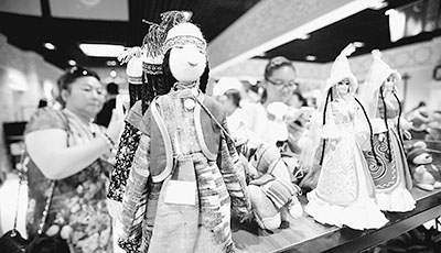 “丝绸之路沿线国家产品体验馆”日前在第十八届西洽会暨丝博会分会场西安华南城开馆。来自古老丝绸之路和海上丝绸之路的哈萨克斯坦、土库曼斯坦、土耳其、越南、柬埔寨、泰国等20多个国家的大量商品参展。图为观众在参观吉尔吉斯斯坦的手工玩偶。