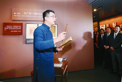 2017年11月6日,“忠诚与信仰”情景党课在上海中共一大会址纪念馆开讲,主持人晨光在情景党课上进行实景表演。新华社发