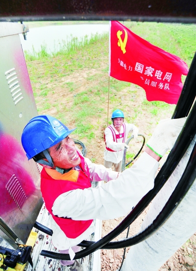 8月19日,安徽电力肥西共产党员服务队队员在进行线路改造。CFP