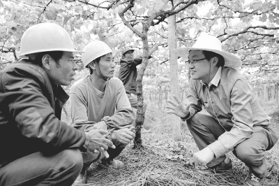 在党的群众路线教育实践活动中,福建省建瓯市驻村干部余建坤(右)在小桥镇高门村葡萄园里向村民了解种植和销售问题。 新华社记者 张国俊摄