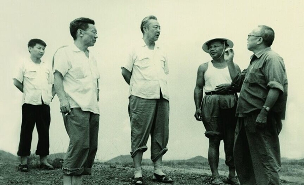 1978年8月,习仲勋(左三)在广东惠阳农村调研。在清华大学读书的习近平(左一)利用暑假时间参加社会实践,随同父亲一起下乡。