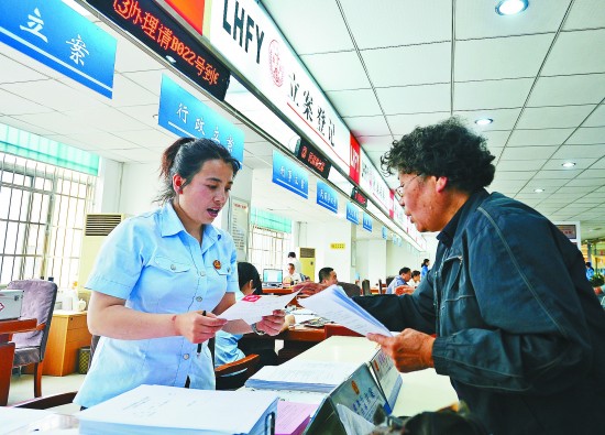 陕西西安,全国法院实施立案登记制改革后,79岁的张霖汾老人来到西安市莲湖区人民法院立案庭,法官经过审核后,当即接收老人的诉状,并现场登记立案,整个过程不到30分钟。据了解,立案登记制的实行,将彻底改变“立案难”问题,切实保障当事人的诉权。视觉中国供图