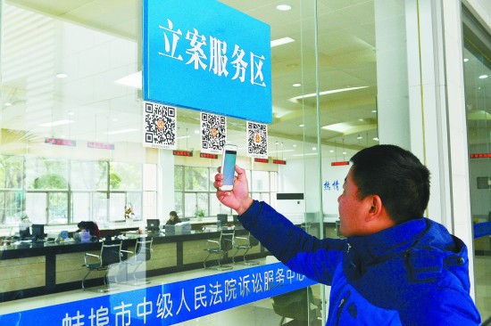 安徽省蚌埠市中级人民法院诉讼服务中心立案服务区外,一位当事人在使用手机扫码。蚌埠市中级人民法院通过二维码生成器,将立案登记的相关规定、各类诉讼须知、法律文书样本、起诉应当提交的材料等诉讼指引材料捆绑打包,前来立案的当事人只需轻滑指尖,用手机扫一扫,即可轻松获取各种诉讼信息。视觉中国供图