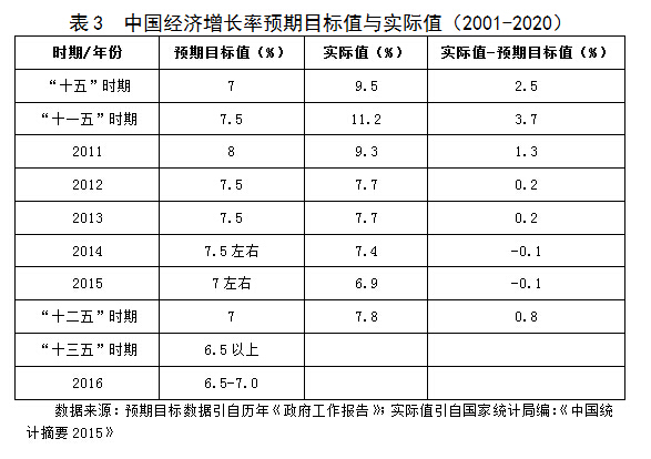 “十三五”时期经济年均增长保持在6.5%以上。这个指标国内外都很关注,既是五年规划的核心指标,又是中国经济发展的风向标。不同于以往历次五年规划经济增长速度的预期目标(见表3),首次将“点目标”改为“区间目标”,这一做法是科学理性的,留有余地。中国经济规模已超过10万亿美元,又更广泛深度融入世界经济,国内外各种不确定性因素更加复杂,例如2015年《政府工作报告》提出货物进出口额达到增长6%的预期目标,但实际结果是负增长,为-7.0%。因此,经济增长率预期目标采用区间目标,这本身就是一个宏观调控手段的创新,从下限看,“6.5%以上”是确保实现到2020年国内生产总值和城乡居民人均收入比2010年翻一番,给市场主体发出了明确的信号,也给国际社会发出了准确的信息,这是“保底线”机制,同时又留有充分余地,从努力方向看,增速争取达到7%,这是力争上游机制。国家规划经济增速区间目标,也给地方提供了明确的信号,有利于推进供给侧结构性改革,加快转变经济发展方式,真正做到“稳增长、调结构”,也为降低能源资源消耗、保护生态环境、降低二氧化碳排放等提供了良好的、宽松的宏观经济环境。实际上,许多地区“十三五”规划已经采用了经济增速区间目标。今后这一作法将成为常态。