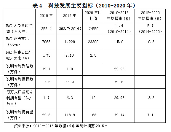 每万人口发明专利拥有量从2015年的6.3件提高至2020年的12件,全国发明专利拥有量从119万件提高至168万件,既反映了中国技术创新资本存量,又充分体现了中国国内自主创新能力的提高。需要说明的是,这一时期全国发明专利拥有量增速预期目标是7.1%,明显低于“十二五”时期的39.1%的速度(见表4),实际执行结果还会高于这些预期指标。