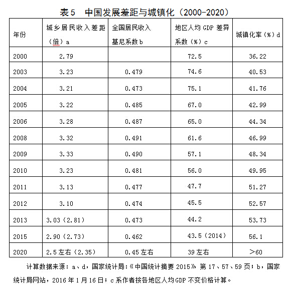 不断缩小区域发展差距。2004年以来,中国的地区差距呈现持续缩小的趋势,各地区人均GDP差异系数从2004年的75.1%下降至2014年的43.5%,下降了31.6个百分点,我们估计,到2020年,各地区人均GDP相对差异系数还会下降至40%以下(见表5)。各地区基本公共服务均等化达到更高水平。这反映了实施“沿海率先发展”、“西部大开发”、“振兴东北老工业基地”、“中部崛起”四大(板块)战略,即区域协调发展总体战略取得了十分积极效果,也反映了市场机制促进人口流动、劳动力流动的作用越来越大,这就形成了“两手合力”,促进中国地区发展差距持续缩小。目前,中国区域发展战略扩展为“4+3”的新版本。在东、中、西、东北地区“四大板块”的基础上,又加上“一带一路”建设、京津冀协同发展、长江经济带发展“三大战略”。基于“两横三纵”为特征的城镇化发展战略所涵盖20多个经济区(可以定义为“小格局”),进一步通过区域战略整合起来,形成国内区域发展的“大格局”,把国内区域与周边和沿线国家发展共同合作统一,推动区域经济一体化、世界经济一体化,这将极大地重塑21世纪中国与世界经济地理。