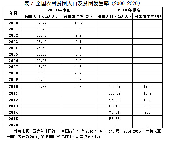 消除极端贫困人口。坚决打赢脱贫攻坚战,我国现行标准下的农村贫困人口实现脱贫,贫困县全部摘帽,解决区域性整体贫困。“十二五”时期,国家制定了现行农村贫困人口标准,即按照每人每年2300元(2010年不变价),高于目前国际贫困线(每人每日支出1.9美元),相当于每人每日支出2.19美元。农村贫困人口从2010年的16567万人消减至2015年的5575万人,减少了10992万人(见表7),到2020年消除国家贫困线以下人口,也意味着中国提前10年实现联合国提出的2030可持续发展目标(SDG发展目标)中的最核心目标,即消除绝对贫困,贫困发生率小于3%。为此,国家还专门设立了脱贫攻坚重点工程8项,举全国之力实现消除极端贫困人口目标。