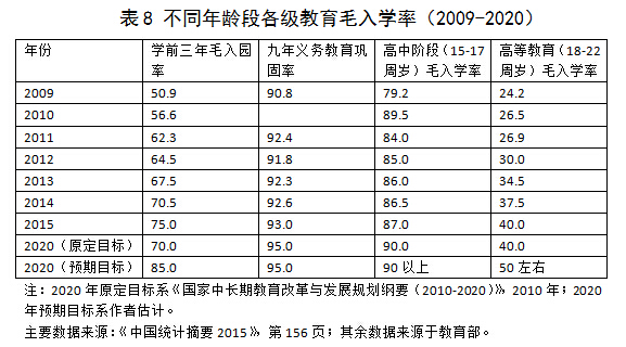 推进教育现代化,提升全民教育水平。其核心指标是:劳动年龄人口平均受教育年限从10.23年提高到10.8年。还提出了三个次优先指标:义务教育巩固率提高到95%;学前三年毛入园率从2015年的75%提高到2020年的85%。这不仅提前实现了原定2020年70%的目标,而且也高于OECD国家的平均水平(82%);高中阶段毛入学率达到90%以上,普及高中教育;高等教育毛入学率达到50%。(见表8)还提出了建设世界一流大学和一流学科等重要目标。 党中央、国务院提出建设世界一流大学的战略设想仅十多年,就获得了重大进展,据泰晤士高等教育、美国新闻与世界报道、QS(Quacquarelli Symonds,英国一家教育组织)等多家大学排行,我国大陆已有30多所大学进入世界前500名,7所大学进入前200名,北京大学、清华大学等跻身前100名。2014年我国高校进入基本科学指标数据库(ESI)世界排名前1%的学科数近600个,进入1‰的学科超过50个。 到2020年,上述世界排名还会明显提高,与中国在世界上的经济地位大体相当。形象的讲,中国大学必须与中国经济巨人的“大脑”、“科学”、“技术”、“学术”、“思想”、“理论”、“知识”、“智慧”、“文化”等相适应、相促进,更要为世界的科技进步、文明进步作出中国大学的应有贡献。为此,国家还专门设立了教育现代化重大工程9项。