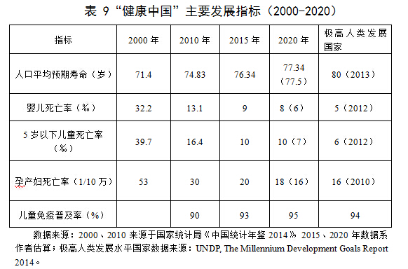 推进健康中国建设,提升全民健康水平。核心指标只有一个,为人均预期寿命提高1岁,从2015年的76.34岁提高至2020年的77.34岁,实际可能超过77.5岁。次优先指标4个,分别是一个卫生人力资源投入指标,即每千人口职业(助理)医师数达到2.5名;其他三个指标分别是健康服务产出指标:婴儿死亡率下降至8‰,5岁以下儿童死亡率下降至10‰,孕产妇死亡率下降至18/10万,实际可能都会低于上述指标。从国际视角看,除人口预期寿命之外,其他三个指标均接近或达到世界极高人类发展组平均水平。(见表9)健康中国还包括建成全民健康社会和全民健身型社会,为此还提出了青年体质达标率达到95%以上的量化指标。国家还专门设立了健康中国行动计划8项工程。