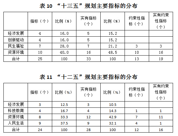 从“十三五”主要指标来看,经济发展有4个,占总数的16%,实有5个,实际占总数的15.2%;创新驱动有4个,占总数的16.0%,实有5个,实际占总数的15.2%;民生福祉有7个,占总数的28.0%,实有7个,实际占总数的21.2%;资源环境有10个,占总数的33.0%,实有16个,实际占总数的48.5%。(见表10)