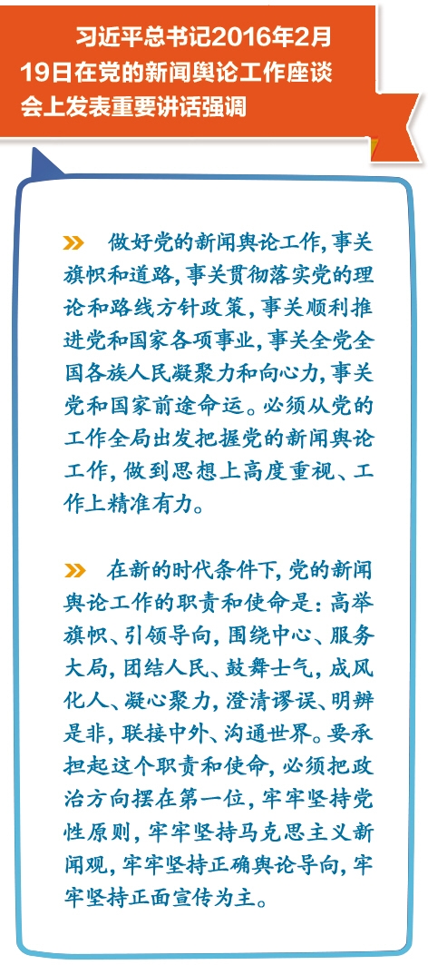 习近平总书记在“2·19”重要讲话中,用“高举旗帜、引领导向,围绕中心、服务大局,团结人民、鼓舞士气,成风化人、凝心聚力,澄清谬误、明辨是非,联接中外、沟通世界”等48个字,对新的时代条件下党的新闻舆论工作的职责和使命,作出了集中鲜明的概括,具有极强的时代特点和指导意义。当前最重要的是,我们要一如既往地牢记光荣使命、神圣职责,坚决落实好贯彻好“48个字”,推动新闻舆论工作可持续地健康发展,为实现“两个一百年”的奋斗目标作出应有贡献。