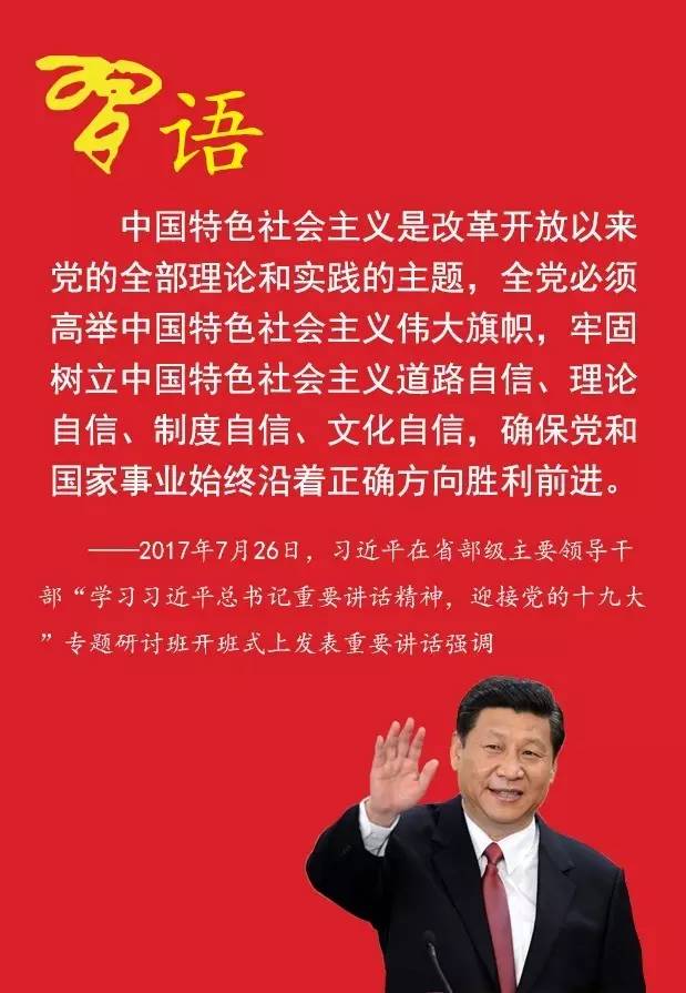 7月26日,习近平总书记在省部级主要领导干部专题研讨班开班式上发表重要讲话强调:“中国特色社会主义是改革开放以来党的全部理论和实践的主题,全党必须高举中国特色社会主义伟大旗帜,牢固树立中国特色社会主义道路自信、理论自信、制度自信、文化自信,确保党和国家事业始终沿着正确方向胜利前进。”这一重要论述,再次明确宣示我们党要高举中国特色社会主义伟大旗帜,坚持走中国特色社会主义伟大道路。
