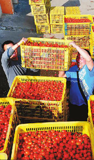 推动特色产业发展,增强贫困地区自我发展能力,是扶贫工作的重要举措。图为在广西百色市田阳县农副产品综合批发市场,工人将西红柿抬上货车。新华社发