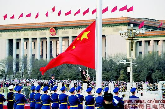 1月1日晨,北京天安门广场举行隆重的升国旗仪式,这是由人民解放军担负国旗护卫任务后,首次举行的升旗仪式。 新华社记者申宏摄