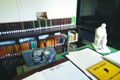朱迪丝还带记者参观了图书馆二层一个只有预约才能参观的重要房间。房间虽然面积不大,不足10平方米,但是历史意义却不同寻常。这个房间叫作“列宁室”,1902年4月至1903年5月,列宁在流亡伦敦期间,曾经在这里编辑《火星报》,并把报纸偷运到俄国。这间办公室至今保存完整,在列宁工作过的办公桌上,摆放着列宁当年编辑、出版的《火星报》和列宁的头像雕塑,房间书架上摆放着列宁的照片。朱迪丝说,这个小房间非常受参观者欢迎。