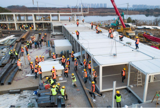 正是由于党的领导,社会主义中国发挥了集中力量办大事的优势,创造了许多人间奇迹。新冠疫情发生后,武汉火神山医院从开始设计到建成完工仅仅用了10天时间。图为2020年1月28日拍摄的武汉火神山医院建设工地。新华社记者肖艺九/摄