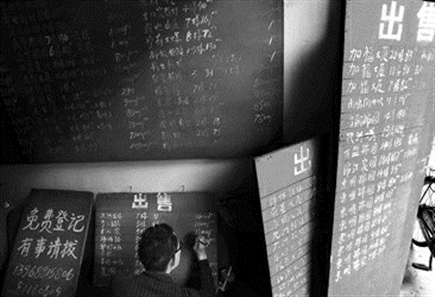 日前,在温州市区江滨路,一房屋中介在红板子上修改下跌的房价。 图/CFP