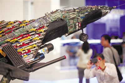 2013年9月25日,北京国际航空展上展出的由芯片、电路板等元器件制作的工业雕塑。CFP供图