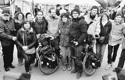 2014年1月27日,“从巴黎到北京——万里单车东游丝路”活动发车仪式在法国巴黎举行,两名法国年轻人在出发前与亲友合影。新华社发