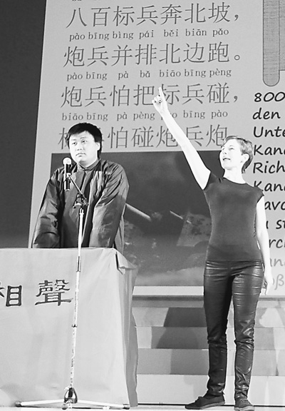 2013年11月18日,在柏林“中德语言年”活动上,两国青年合作表演相声。本报记者 管克江摄