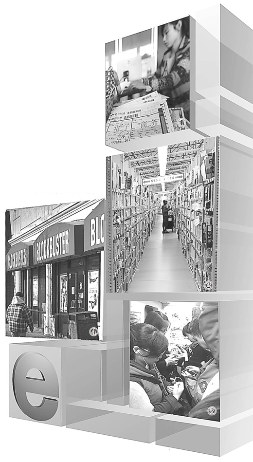图④: 互联网视频对传统音像行业造成毁灭性打击,2013年美国DVD影碟租赁连锁Blockbuster也关闭了多家门店。