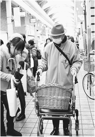 日本富士山街头老人正在使用可坐可行的四轮助步车。本报记者 田 泓摄