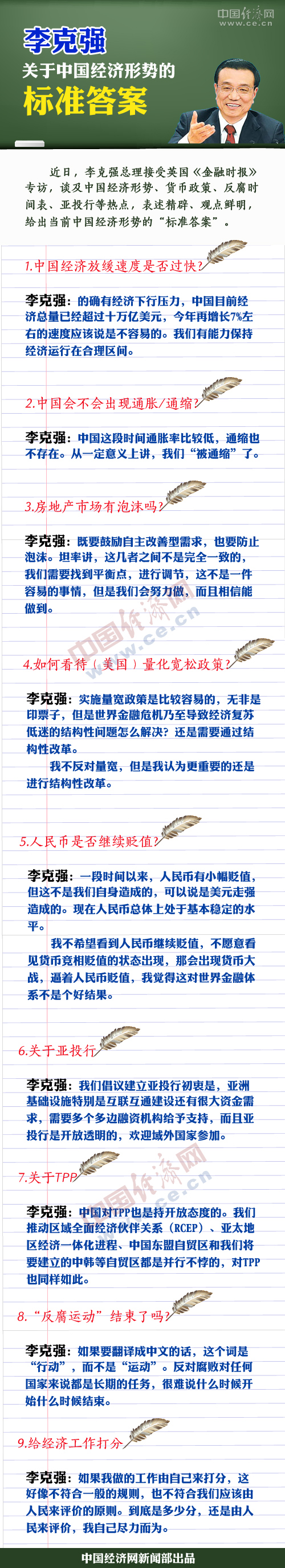 中国经济网编者按:近日,李克强总理接受英国《金融时报》 专访,谈及中国经济形势、货币政策、反腐时间表、亚投行等热点,表述精辟、观点鲜明, 给出当前中国经济形势的“标准答案”。