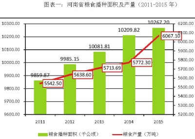 图一:河南粮食播种面积及产量(2011—2015)