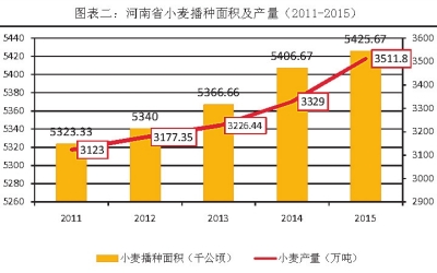 图二:河南小麦播种面积及产量(2011—2015)